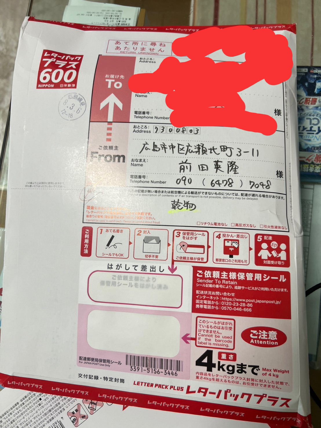 贈り物を送るために、レターパックプラスで発送したのですが・・・